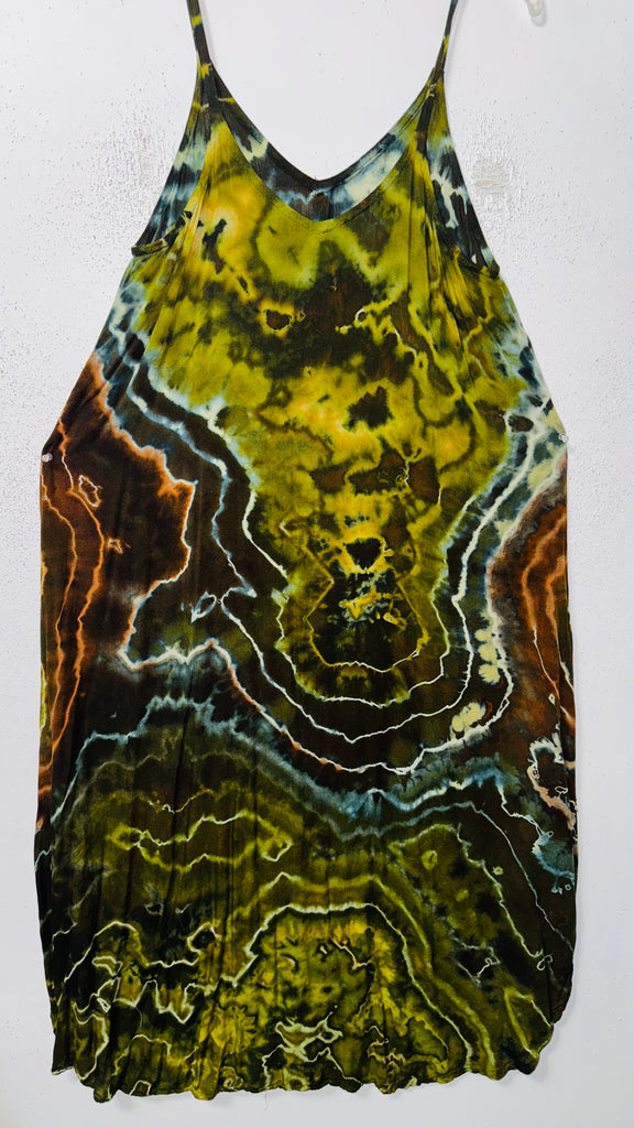 See size chart in the photos. This tie dye maxi  dress is light as a feather. Last summer I got poison ivy all over and this style dress was my saving grace, it feels like you’re naked! It is oversized everywhere except the chest. Check the size chart, it has no stretch it is 100% rayon