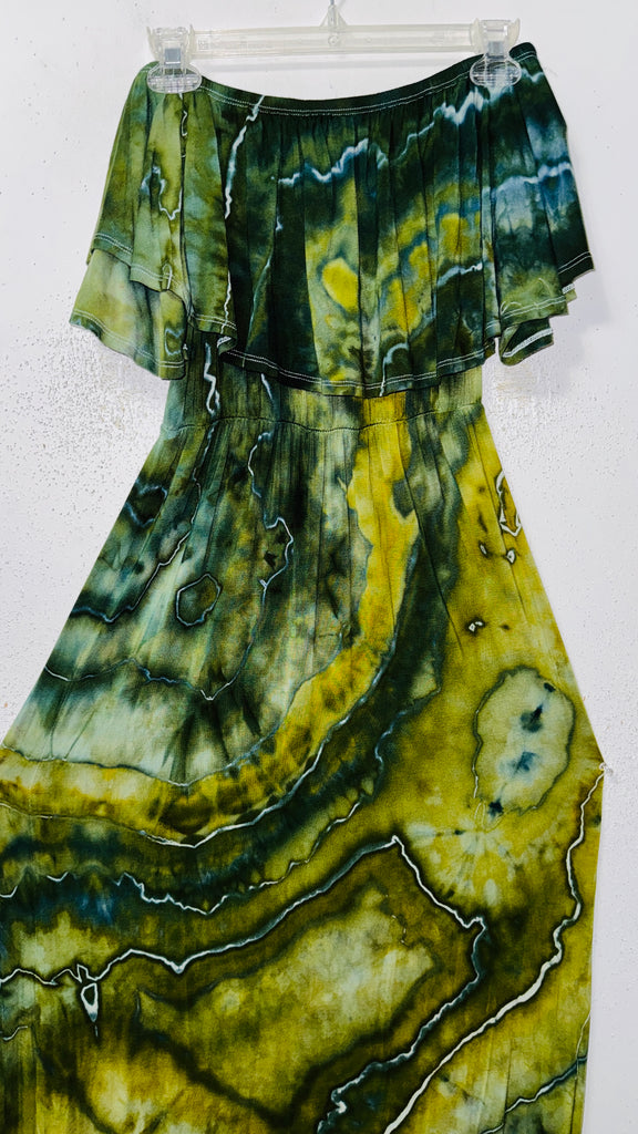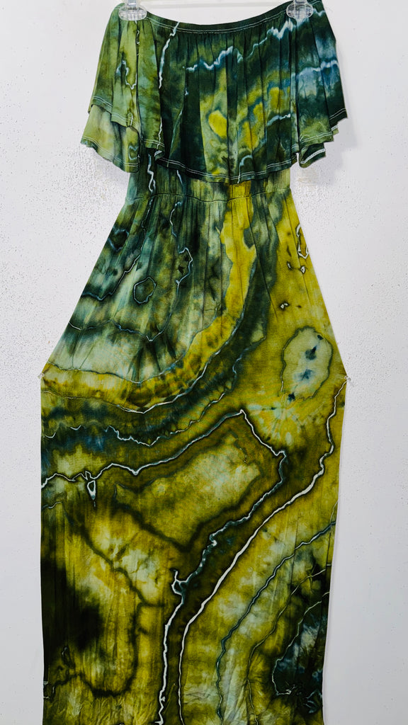 pit to pit 14" wide, waist 14" but can stretch larger, (elasticsized), hips free, 55" long