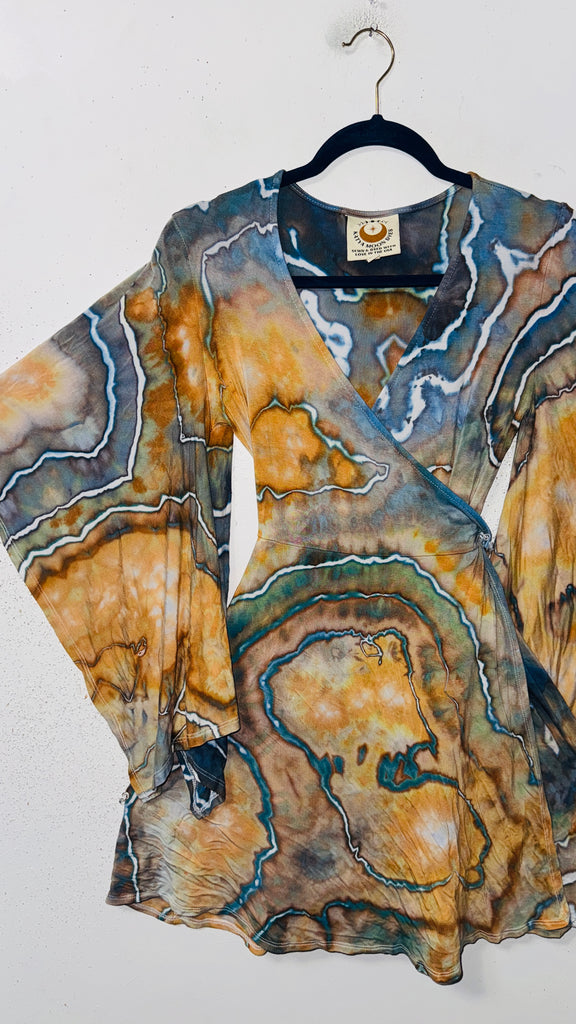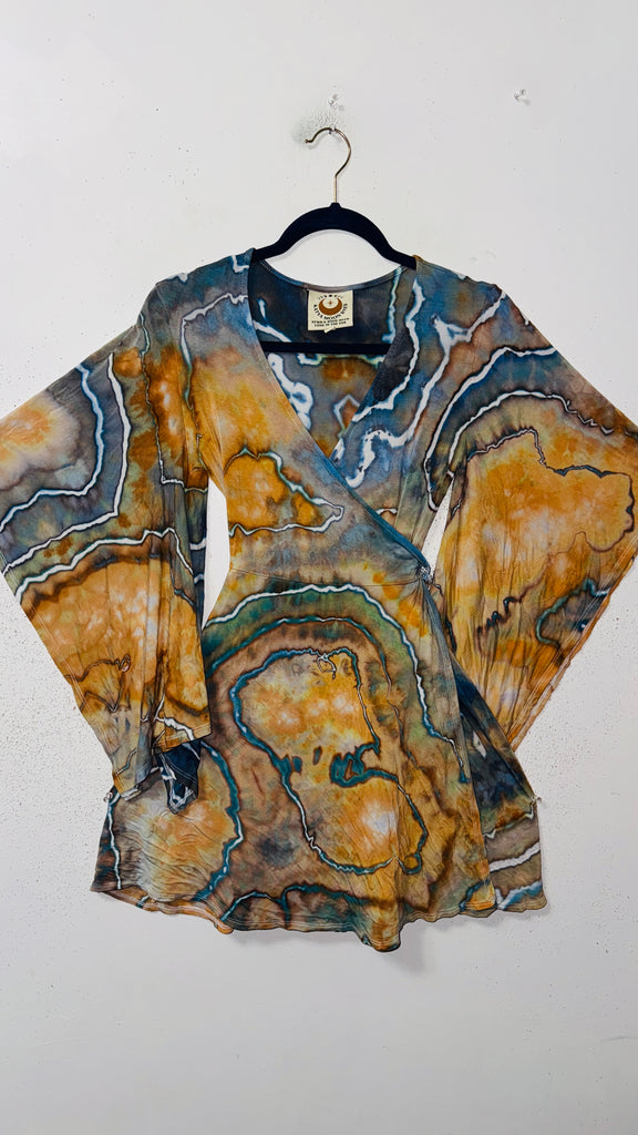 the bell sleeves have slits in them to give them more movement, it's a true wrap style so super adjustable in size.