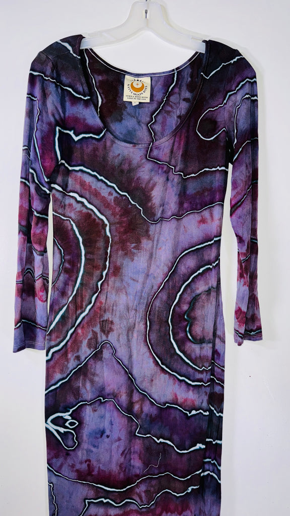 95% rayon, 5% spandex, 17" pit to pit,14" waist , 17" hips, 56" long