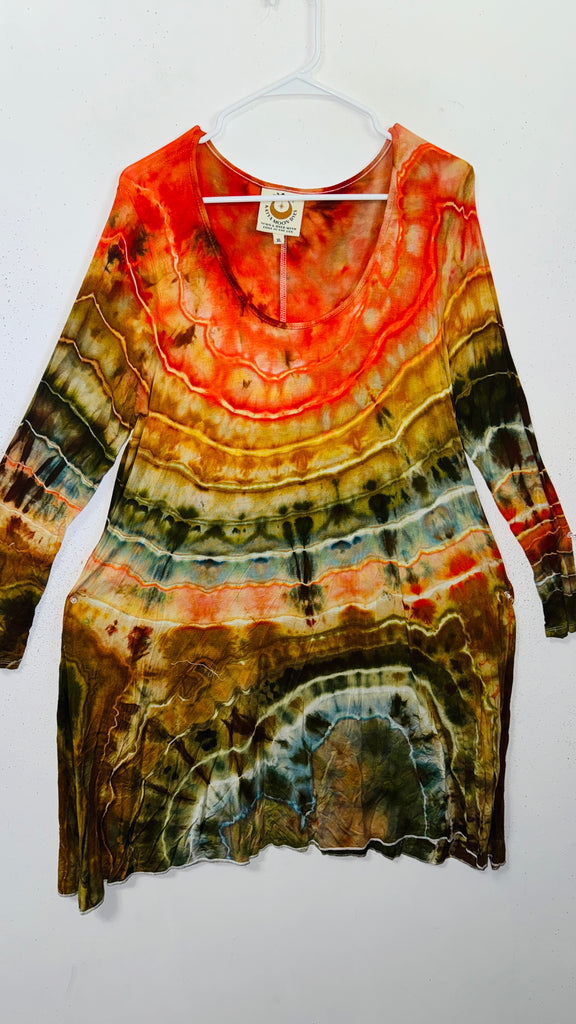 95% modal 5% spandex, sewn and dyed in the USA, 18" laying flat pit to pit, 26" wide at hips, also laying flat. approx 34" long, has pockets, could fit a 1XL too.