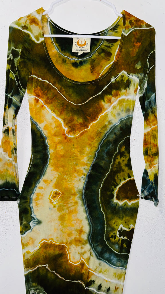 95% rayon, 5% spandex, 15" pit to pit, , 15" hips, 54" long 12" waist