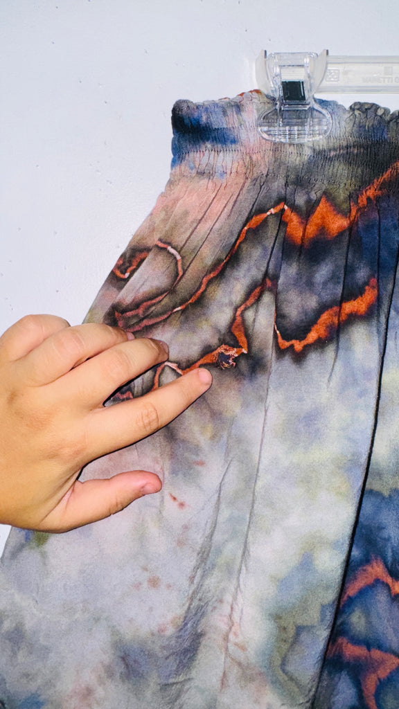 waist is 34" unstretched and goes to 54" comfortably with a wide waistband enclothed in fabric , 38.5 inches long