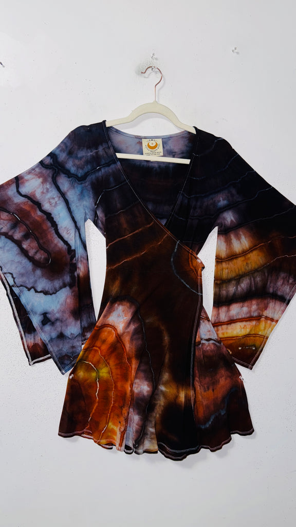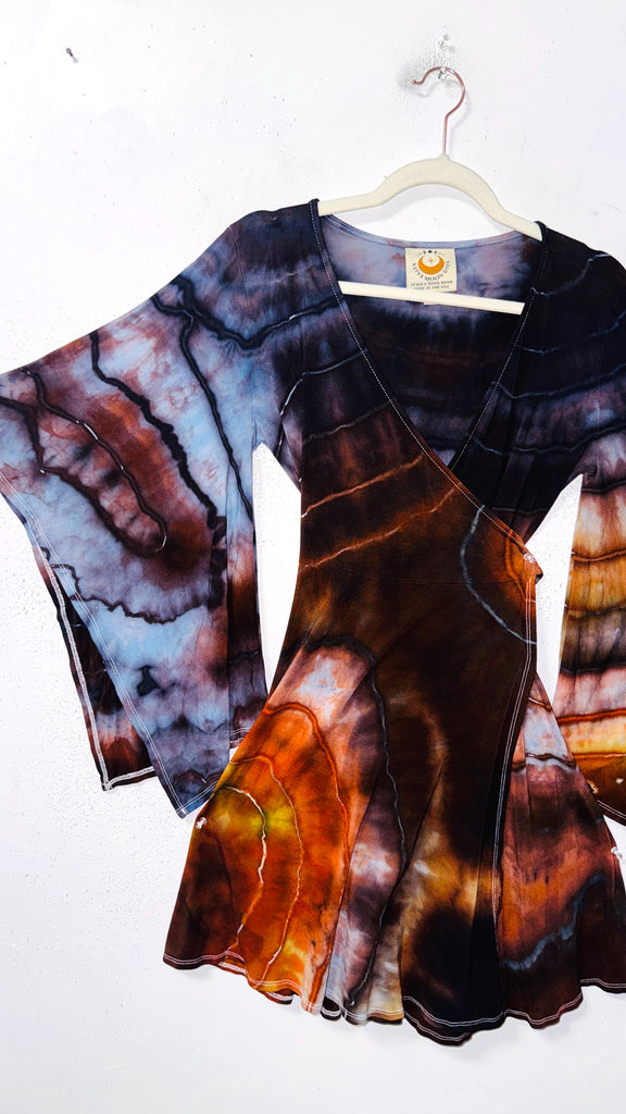 the bell sleeves have slits in them to give them more movement, it's a true wrap style so super adjustable in size.