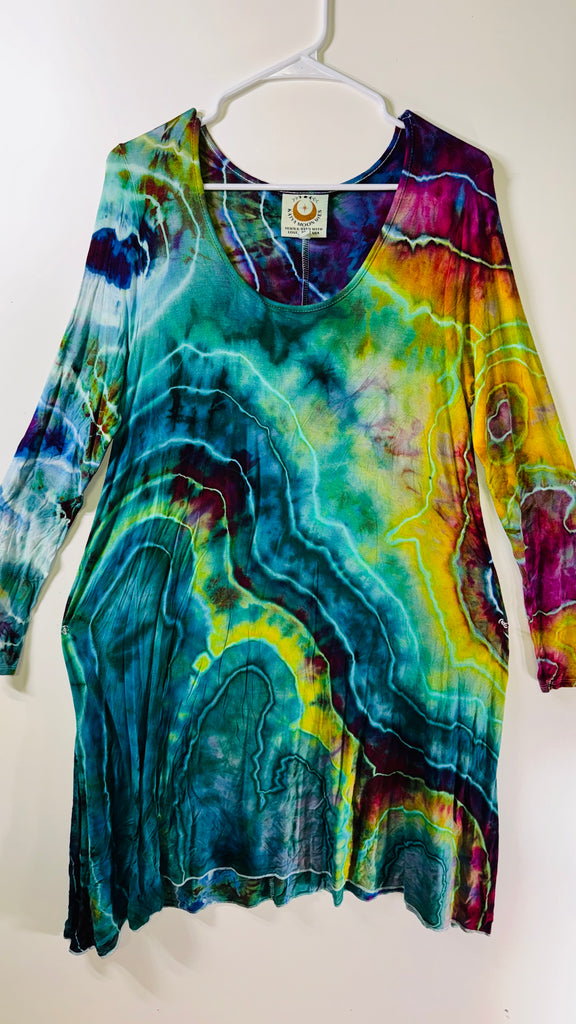 95% modal 5% spandex, sewn and dyed in the USA, 18" laying flat pit to pit, 26" wide at hips, also laying flat. approx 34" long, has pockets, could fit a 1XL too.